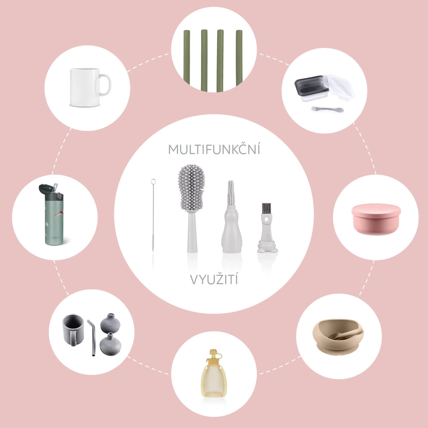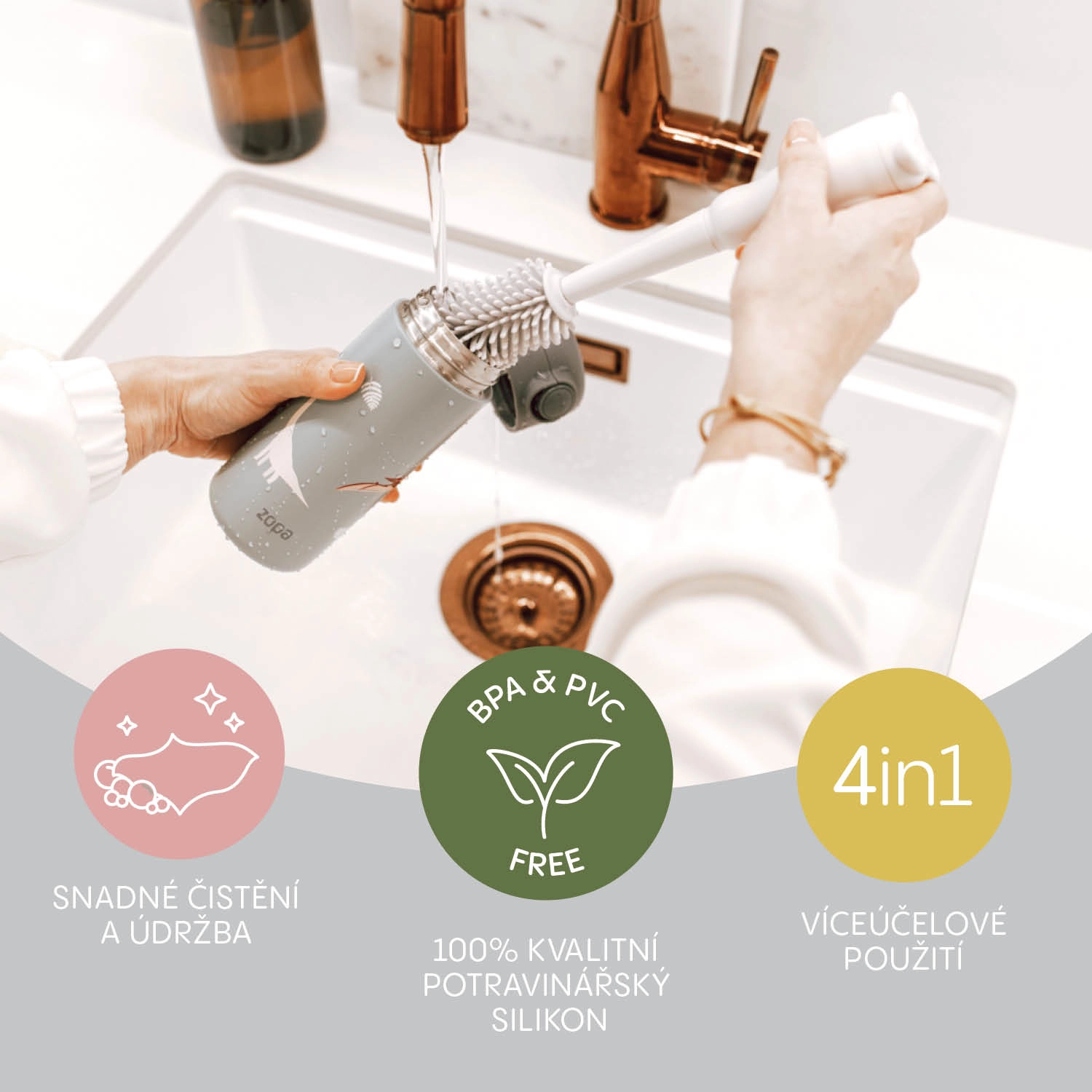 Potete scegliere il biberon in vetro per la massima purezza del gusto, il leggero biberon in plastica (PP/Tritan) o il morbido biberon in silicone. Tutti sono sicuri e senza BPA (senza BPA, BPS e ftalati), hanno un collo ampio per una pulizia facile, scala di misurazione ben visibile, tappo ermetico e una forma che assicura una presa stabile. Resistono alle alte temperature e si possono sterilizzare e lavare in lavastoviglie.