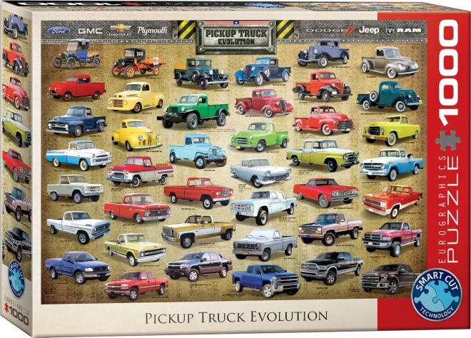 Scoprite un puzzle elegante con il tema dell’evoluzione dei pick-up del marchio EUROGRAPHICS da 1000 pezzi. Il taglio non convenzionale con forme insolite dei pezzi aumenta la difficoltà e rende l’assemblaggio più lungo e divertente. Le didascalie sull’immagine sono in lingua inglese. Dimensioni una volta composto circa 67,63 × 48,89 cm.