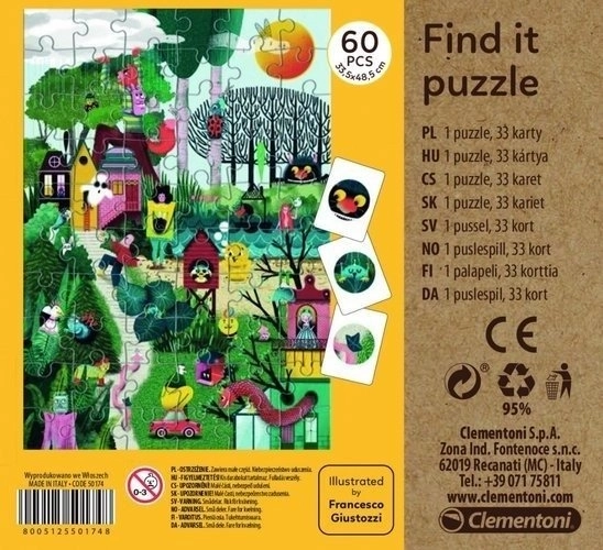 Puzzle con motivo fiabesco autunnale e 33 carte che rendono il divertimento continuo anche dopo aver composto l’immagine. Dopo aver completato il puzzle, cerca sull’immagine i soggetti raffigurati sulle carte. Riuscirai a trovarli tutti? Nella confezione è inclusa anche una guida modello. I puzzle per bambini fanno parte del programma ecologico CLEMENTONI Play for Future, creato per trasmettere ai più piccoli l’importanza della sostenibilità e della tutela dell’ambiente.