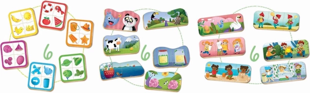 Il set di puzzle per bambini della società spagnola Educa è progettato appositamente per bambini dai 2 anni. Ogni pezzo è realizzato in cartone rigido spesso 4mm e grazie alla sua dimensione si adatta facilmente alle mani piccole. Questo set incoraggia l'immaginazione, l'attenzione e la curiosità dei bambini attraverso tre diverse attività puzzle: