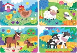 La confezione include quattro puzzle separati con diversi livelli di difficoltà. Grazie alla progressione da 5 a 8 pezzi, i bambini acquisiscono naturalmente sicurezza nel comporre e provano gioia per ogni immagine completata.
