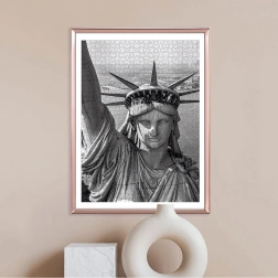 Il primo piano dettagliato della testa e della corona della Statua della Libertà risalta grazie al contrasto e alla stampa precisa: ideale per gli amanti del design e della fotografia.