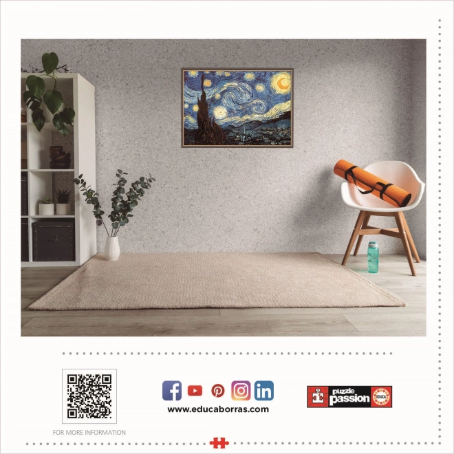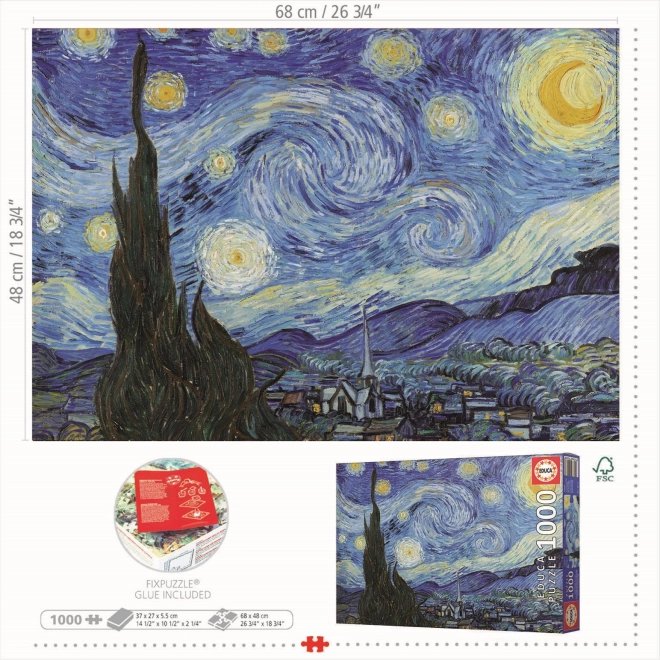 Goditi relax e divertimento con il bellissimo puzzle EDUCA ispirato al capolavoro Notte stellata. La confezione include 1000 pezzi e colla FIX PUZZLE in omaggio per fissare facilmente l'immagine finita. Una volta completato, il puzzle misura circa 68 × 48 cm, dimensione ideale per incorniciare ed esporre.