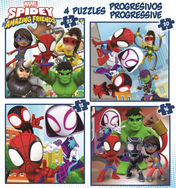 I puzzle progressivi SPIDEY e i suoi fantastici amici 4in1 portano ai bambini la gioia dell’assemblaggio e li aiutano, in modo discreto, ad allenare concentrazione e pazienza. Quattro puzzle diversi con 12, 16, 20 e 25 pezzi permettono un passaggio fluido a immagini più impegnative e sostengono lo sviluppo del pensiero logico.