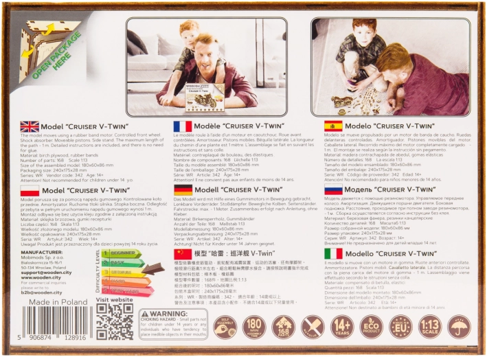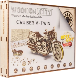 Nel modello sono presenti dettagli di una vera moto: - cavalletto funzionante, - frecce direzionali, - targa, - catarifrangenti, - specchietti retrovisori. Il puzzle 3D WOODEN CITY Cruiser V-twin sarà il miglior regalo per ogni amante delle motociclette.