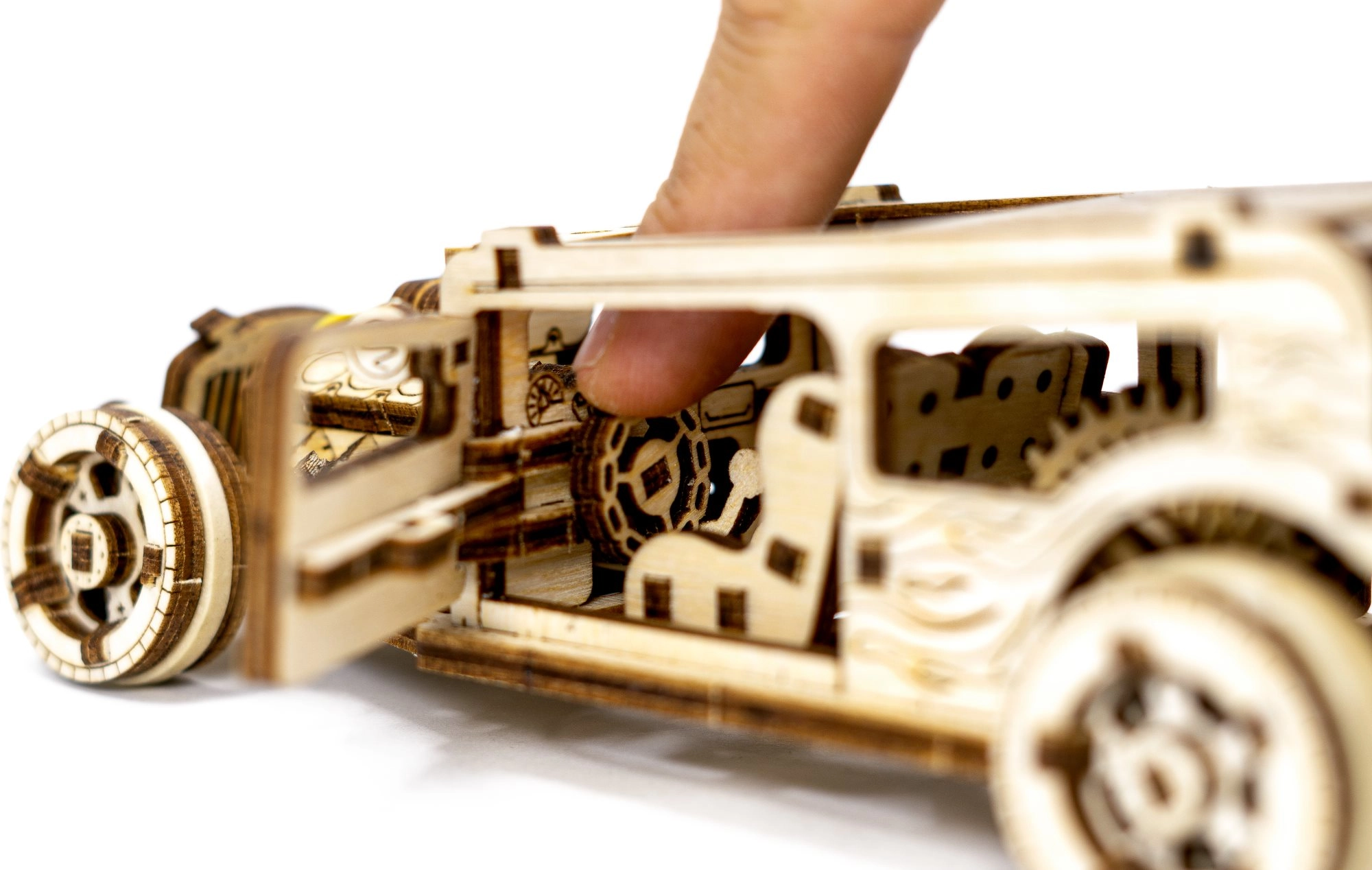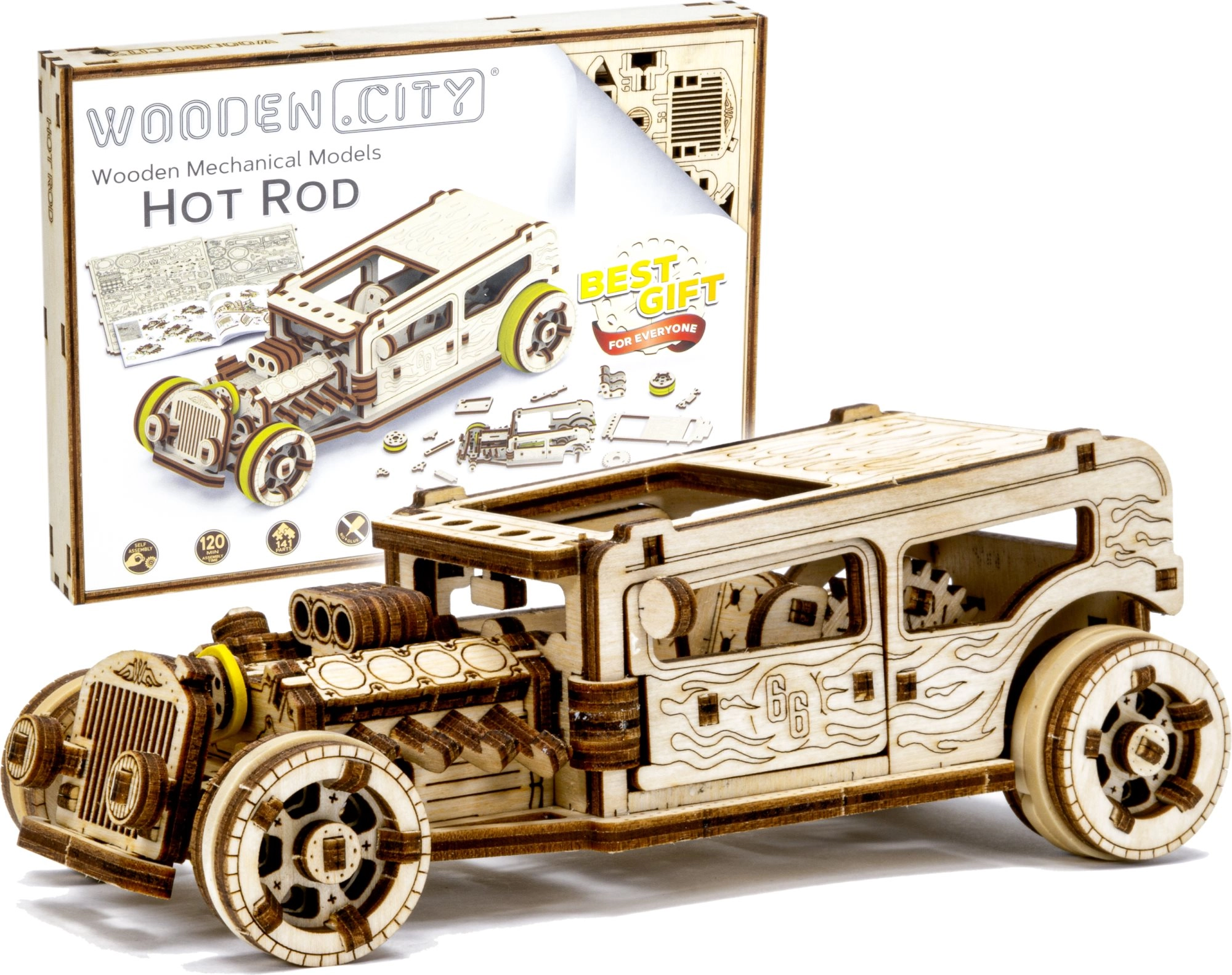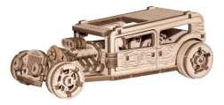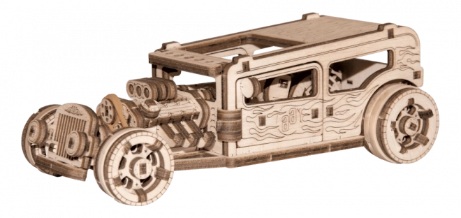 Goditi l’assemblaggio di un modello Hot Rod realistico in legno naturale. Grazie al taglio laser preciso e agli intelligenti incastri dei pezzi, il modello si monta senza colla né attrezzi. L’Hot Rod ha ruote anteriori sterzanti, meccanismo a volano, porte apribili con fermo e una “targa” come una vera auto.