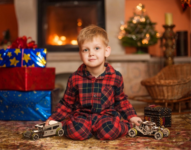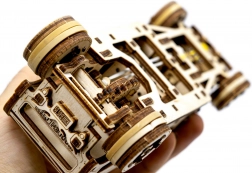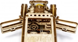 Guardando attraverso il tetto vedrai il motore dettagliato, il sedile doppio e la leva del cambio. Grazie alla meccanica ben studiata ti divertirai non solo durante il montaggio, ma anche nel gioco e nell’esposizione. Il modello è realizzato in compensato di betulla ecologico, nella confezione è incluso un manuale illustrato. Difficoltà 3/5, tempo di montaggio indicativo circa 2 ore.