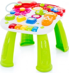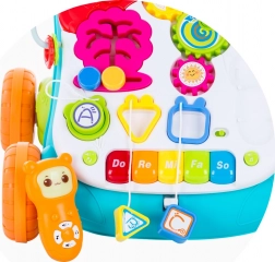 Il tavolino offre pulsanti, ingranaggi e una mini tastiera con note che favoriscono la motricità fine, la coordinazione mano–occhio e la percezione del ritmo.
