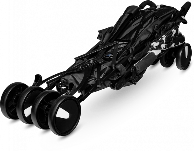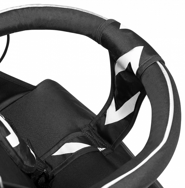 Cinture a 5 punti con morbidi spallacci, barra anteriore e freno a pedale per arresti sicuri. Ruote girevoli in EVA con possibilite0 di bloccaggio e sospensioni anteriori per una marcia fluida.