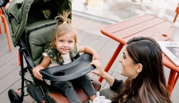 Cinture a 5 punti con morbidi copricintura, barra di protezione con vassoio per la merenda e portabicchiere. Il passeggino è stato testato nei laboratori SGS e rispetta severi standard.