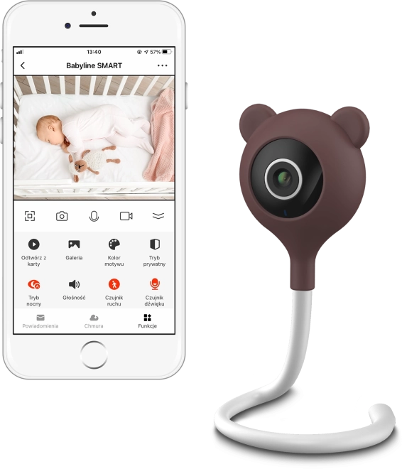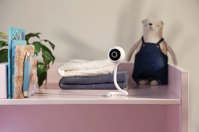 Il supporto flessibile facilita il posizionamento su mobili o sulla culla e il design elegante con cover in silicone con “orecchie d’orso” si integra perfettamente nella cameretta. Per un addormentamento sereno sono disponibili ninne nanne e suoni della natura.
