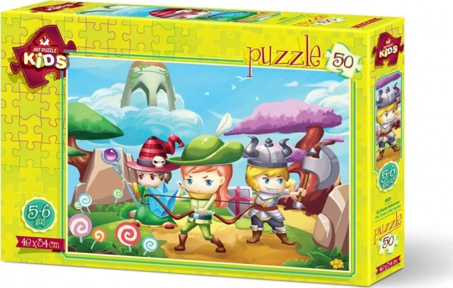 Scopri il divertimento per i più piccoli con un puzzle di qualità da 50 pezzi che sviluppa il pensiero logico, la pazienza e la motricità fine. L’immagine “Tre piccoli eroi” piacerà a bambini e genitori e, una volta composto, misura circa 48 × 34 cm.