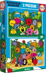 Confezione doppia di puzzle per bambini di alta qualità del marchio EDUCA con i personaggi Monsieur Madame. Ogni puzzle ha 20 pezzi e, una volta assemblato, misura circa 28 × 20 cm – dimensione ideale per le mani dei più piccoli e per le prime composizioni.