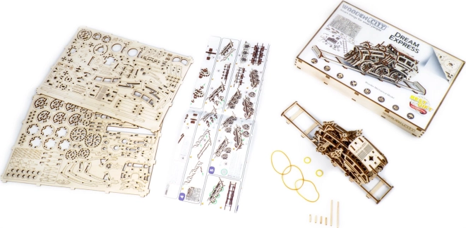 Il modello Express dei sogni è dotato di ruote motrici e può muoversi in avanti, indietro e in cerchio. Raggiunge una distanza fino a 3 metri con il pieno avvolgimento del motore a elastico. È un ottimo modo per avvicinare bambini e adulti ai principi della meccanica e alla manualità dell'assemblaggio. Nella confezione è incluso un manuale illustrato che facilita il montaggio del modello.
