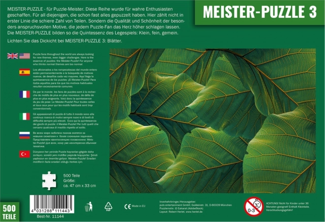 Goditi un assemblaggio impegnativo con il terzo soggetto della serie Meister-Puzzle – Foglie. 500 pezzi e il formato compatto 47 × 33 cm faranno felici tutti coloro che cercano una vera sfida e desiderano portare le proprie abilità a un livello superiore.