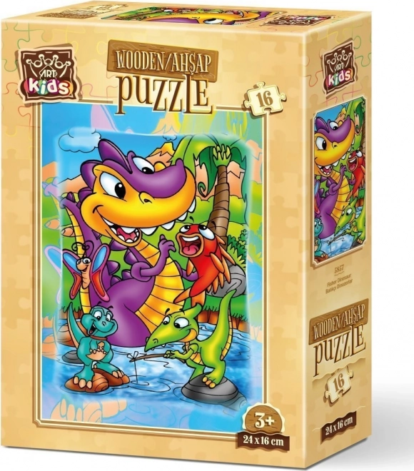Divertente puzzle in legno con dinosauri intenti a pescare che farà felici piccoli costruttori e principianti. Contiene 16 pezzi robusti in sottile compensato di legno e, una volta assemblato, misura circa 16 × 24 cm.