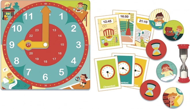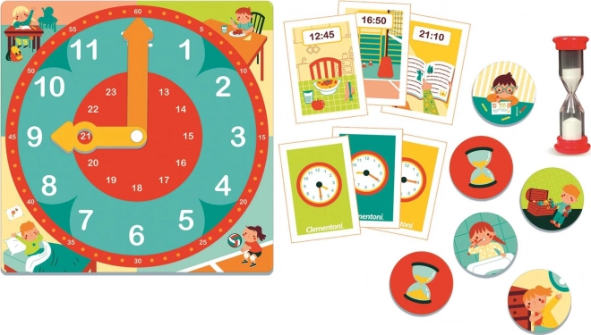 Include un grande orologio con lancette regolabili e carte illustrate che facilitano l’apprendimento.