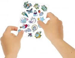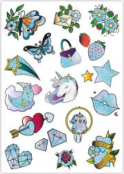 Il set Crazy Chic Tatuaggi Glitterati contiene una vasta gamma di design, tra cui unicorni, farfalle e altri motivi. I tatuaggi sono facili da applicare e testati dermatologicamente.