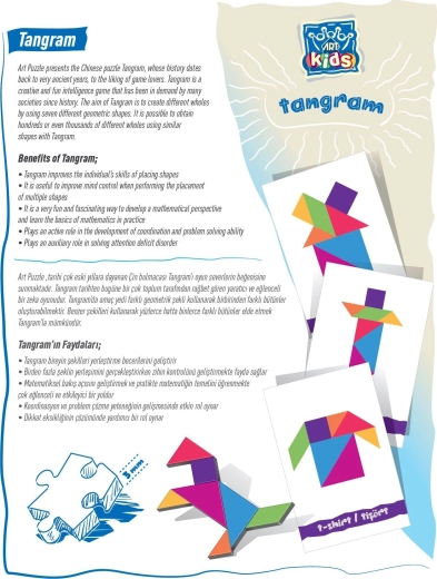 Il segreto nascosto nel puzzle. L’obiettivo del gioco Tangram è creare figure utilizzando sette diversi forme geometriche. I tangram sono un gioco cinese molto antico. Nessuno sa esattamente quando e come sia nato. Secondo una leggenda di oltre 1000 anni fa, un uomo di nome Tan fece cadere a terra una piastrella che si ruppe in 7 pezzi. Cercando di ricomporla in un quadrato, scoprì che era possibile creare molte forme diverse. - Un interessante rompicapo per un solo giocatore. - Componi il tangram seguendo i modelli nelle immagini, a tempo o semplicemente per passare il tempo. - Pezzi colorati resistenti, spessore 3 mm. - 30 carte con immagini di animali, edifici e oggetti. - Comporre il tangram sviluppa la percezione spaziale, la pazienza e la capacità di risolvere problemi. - Con il tangram si possono creare migliaia di figure diverse; puoi trovare altra ispirazione liberamente su Internet. Contenuto della confezione: 7 pezzi, 30 carte con immagini modello