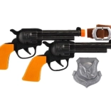 Due revolver dal design stiloso con impugnatura arancione e canna nera per un’autentica esperienza western in ogni duello immaginario.