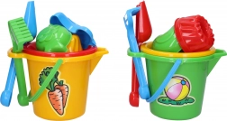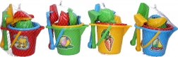 Divertente piccolo set da sabbia con pratico secchiello con beccuccio, ideale per i bambini sia al parco giochi sia al mare. Include setaccio, rastrello, paletta e 3 formine (ciambella, pesciolino, paperella) in quattro colori vivaci.