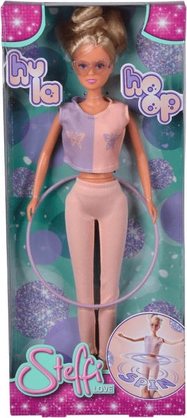 Bambola Steffi è ideale per piccoli sportivi! Viene con un cerchio hula hoop che gira intorno alla sua vita ed è vestita con abbigliamento sportivo e scarpe da ginnastica bianche.