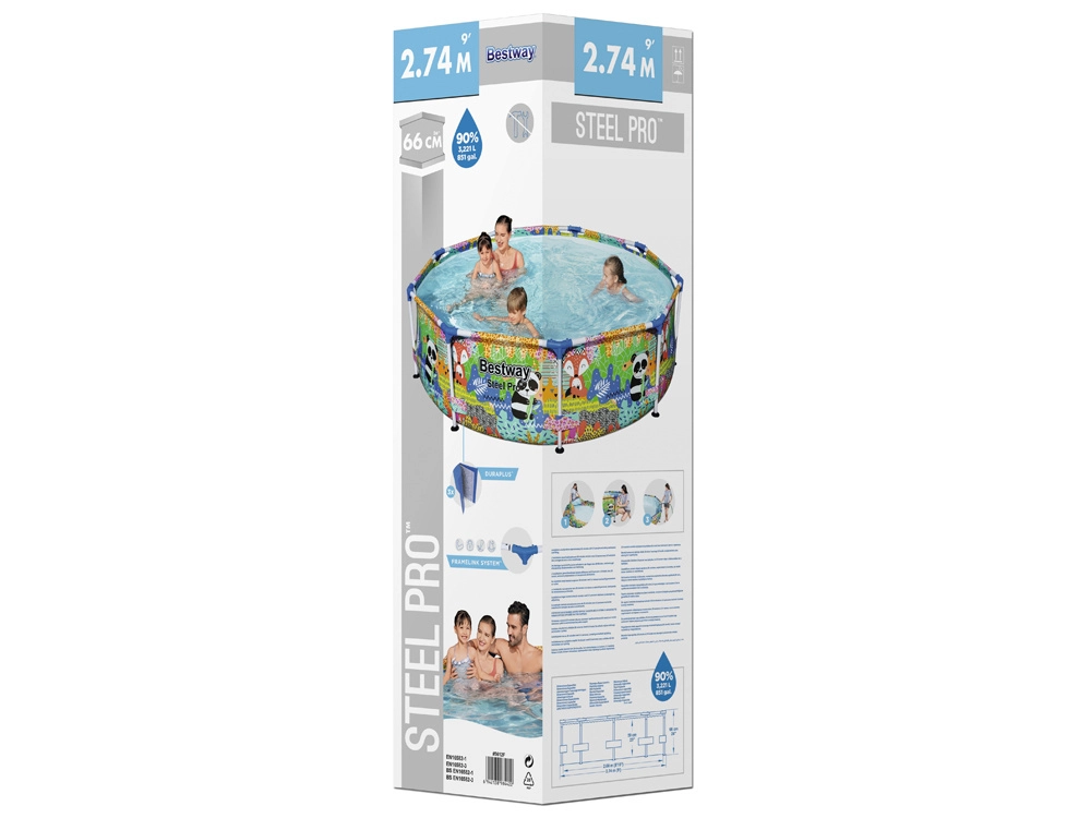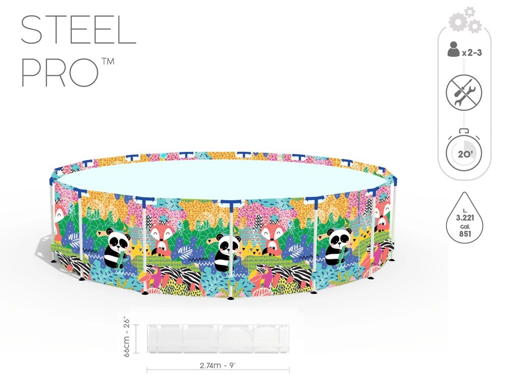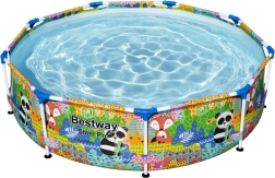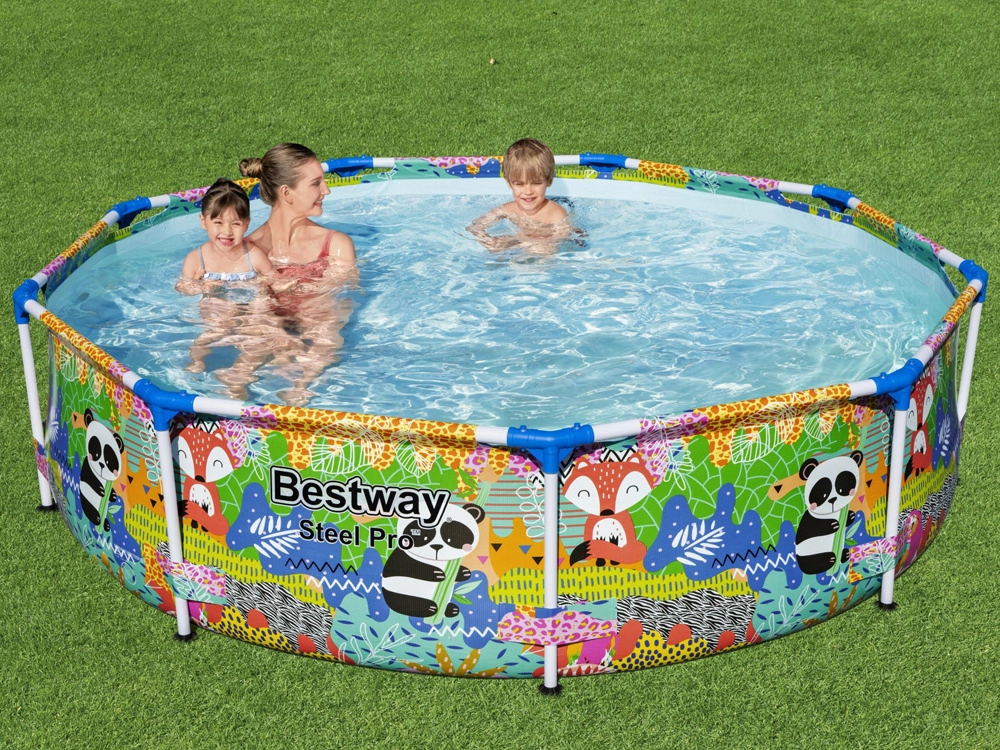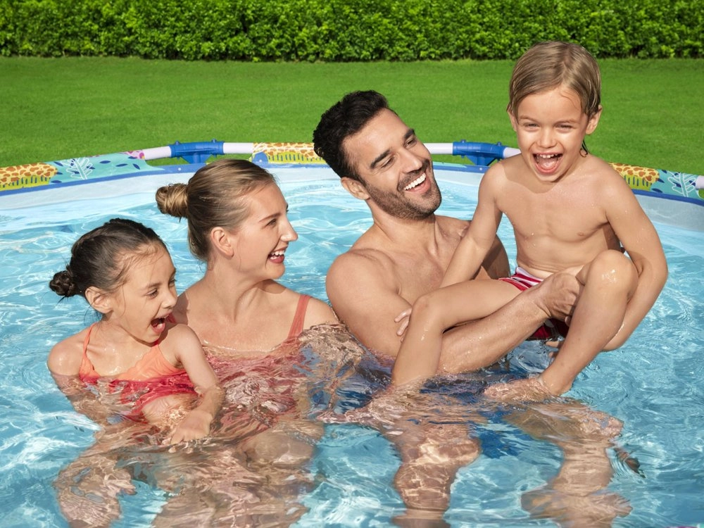 Scelta ideale per giardini piccoli, cortili o terrazze: la piscina rotonda con telaio BESTWAY, facile da montare, porta freschezza e tanto divertimento per bambini e genitori. Il telaio in acciaio stabile e le morbide pareti di qualità con allegra grafica di animali creano un ambiente sicuro per i giochi in acqua.