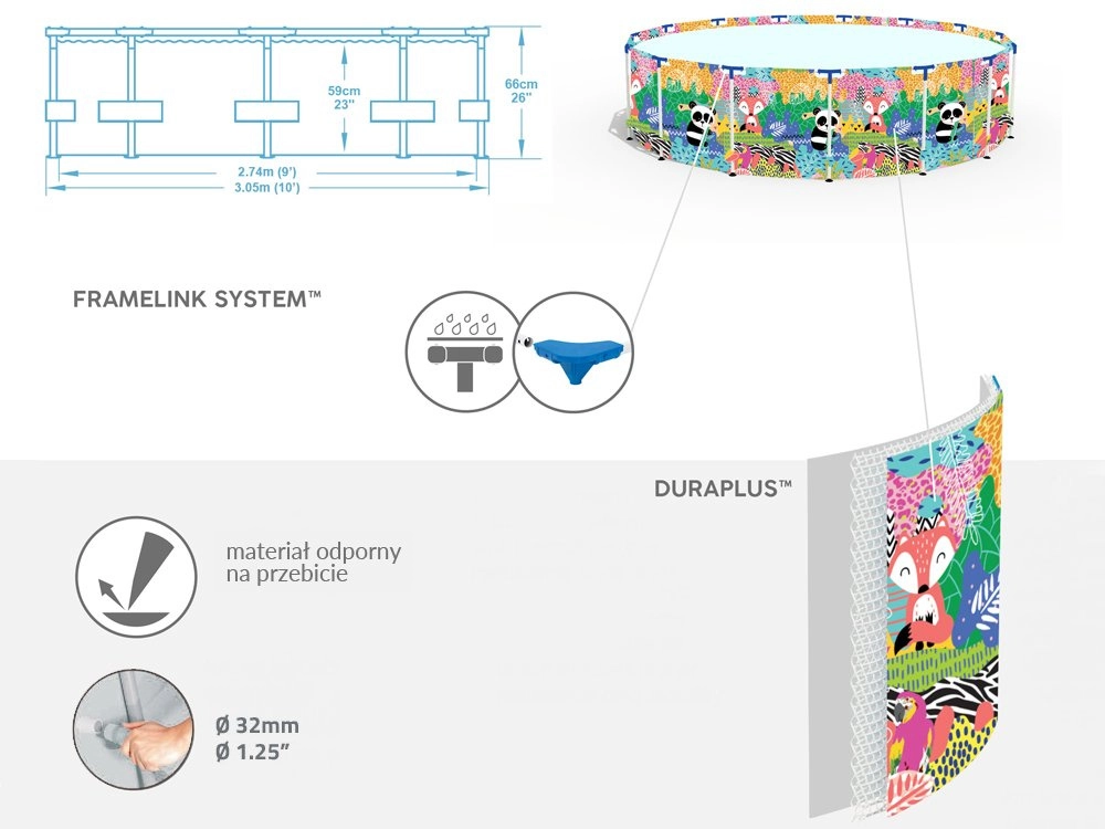 La tecnologia Steel Pro con FrameLink System riduce al minimo la corrosione nei collegamenti metallici, mentre il materiale a tre strati DuraPlus (rete di poliestere tra due robuste membrane in PVC) aumenta la resistenza a strappi e usura. Grazie alla valvola di scarico integrata e ai raccordi per FlowClear, la manutenzione della piscina è semplice e veloce.