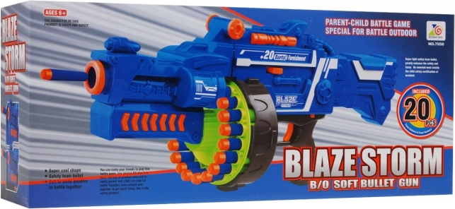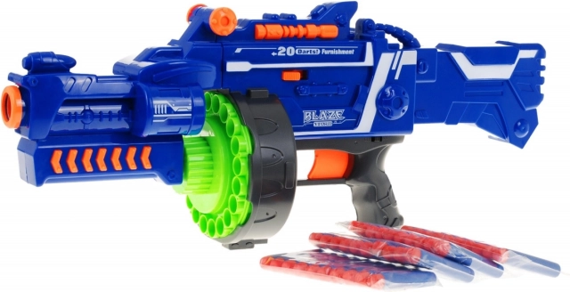 Regala ai bambini un divertimento d’azione con il blaster BLAZE STORM – uno spara‑dardi semi‑automatico con caricatore a tamburo da 20 dardi, motore elettrico e cadenza di tiro fino a 3 dardi al secondo. Offre gittata di circa 10 m, dardi in schiuma sicuri e sicura del grilletto. Adatto ai bambini dai 6 anni. Alimentazione 5× AA (non incluse).