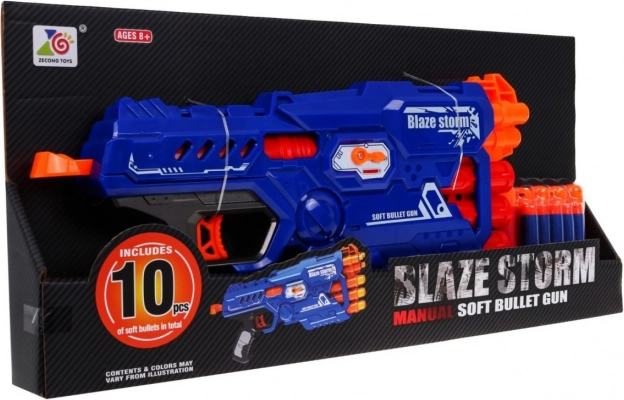 Vivi un divertimento d'azione con il blaster BLAZE STORM per bambini dagli 8 anni in su. Questo manuale lanciadardi a 6 canne non richiede batterie, offre la scelta tra dardi in gommapiuma piccoli blu e grandi rossi e sviluppa precisione e coordinazione.