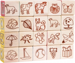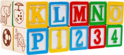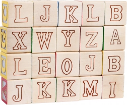 Il set contiene 20 blocchi di legno con lettere e immagini, che aiutano i bambini a imparare l'alfabeto e a sviluppare la creatività.