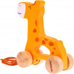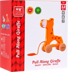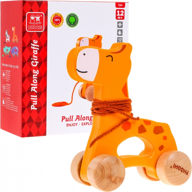 Adorabile giraffa trainabile in legno progettata per bambini dai 12 mesi. È dotata di ruote e una cordicella per un facile traino, favorendo lo sviluppo delle capacità motorie e la coordinazione.