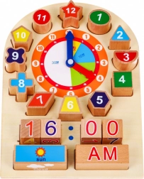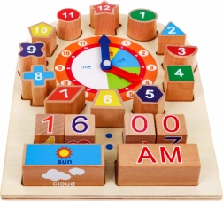Questo set di orologi in legno aiuterà il tuo bambino a riconoscere facilmente l'ora, le parti della giornata, il tempo e i mesi. Include due lancette mobili che possono essere impostate liberamente per diverse ore. Il bambino può immediatamente registrare l'ora usando i cubi numerici e riconoscere i momenti della giornata, che sia soleggiato, nuvoloso, piovoso o nevoso. I cubi numerici hanno forme diverse che devono essere collocate correttamente sulla lavagna.