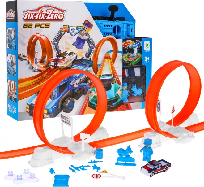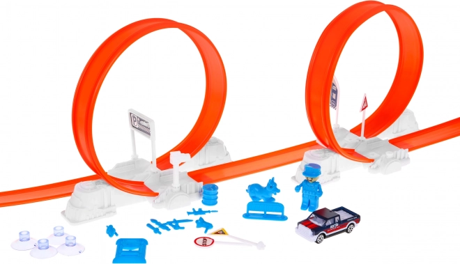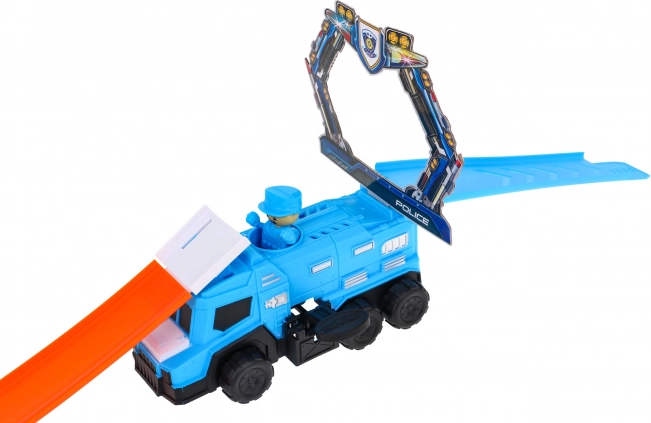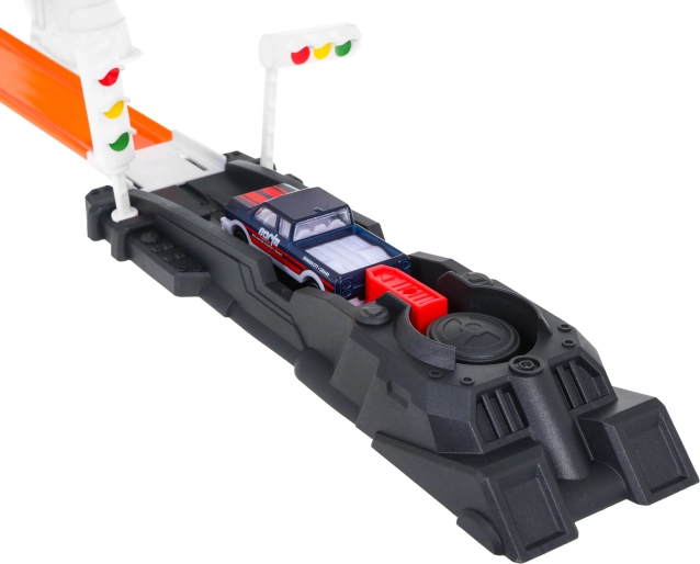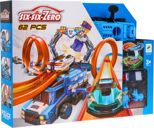 Costruisci il tuo tracciato adrenalinico a tema polizia e manda le macchinine in due grandi loop con rotazione completa a 360°. Il potente lanciatore garantisce la velocità necessaria e il grande camion della polizia diventa il centro di ogni inseguimento. La speciale macchinina, quando viene bagnata, cambia colore, così ogni corsa porta nuovi effetti e storie.