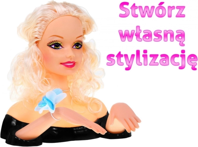 - Testa di bambola per styling, pettine, elastico decorativo, mollette per capelli