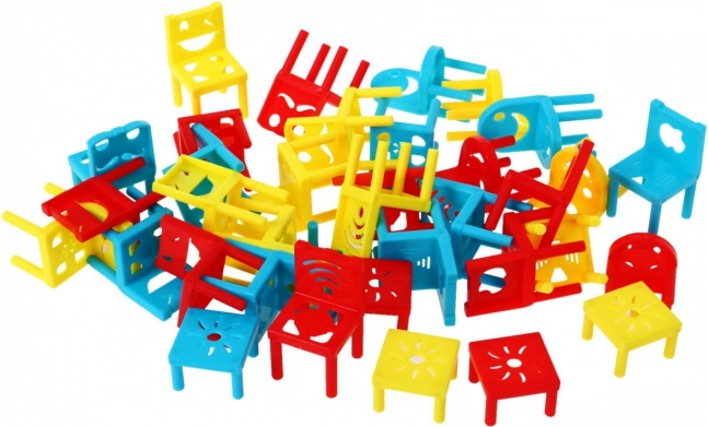 Costruisci la torre più alta e stabile possibile con sedie e tavolini di vari colori, senza far crollare la struttura. I giocatori aggiungono progressivamente i pezzi e non possono toccare gli elementi già posizionati. Vince chi riesce a completare per primo la torre o chi mantiene la struttura in piedi più a lungo.
