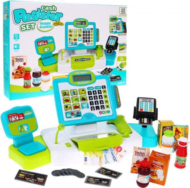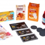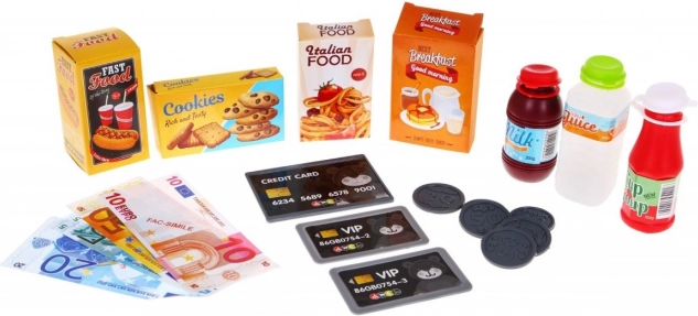 Il set include molti accessori, come imitazioni di prodotti alimentari e carte (VIP e carte di credito), che arricchiscono l'immaginazione dei bambini e permettono di giocare al ruolo del venditore in un negozio.