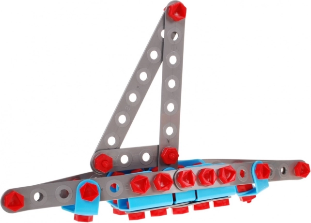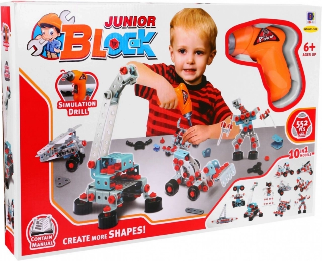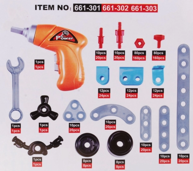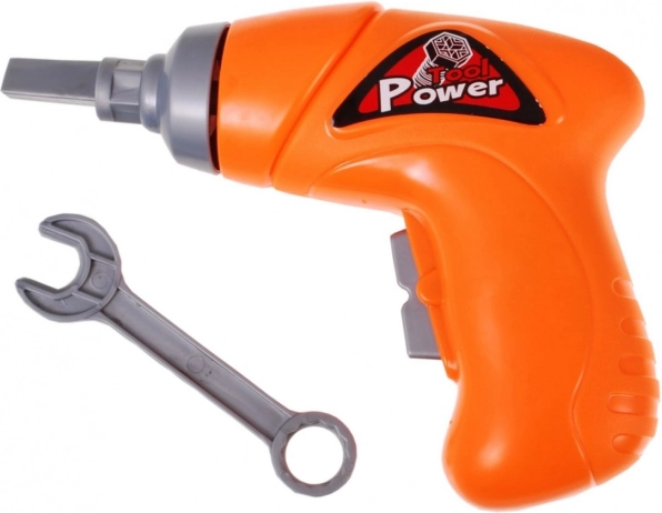 La costruzione include un cacciavite elettrico in plastica e una chiave inglese, che consentono ai bambini di azionare le loro creazioni meccaniche.