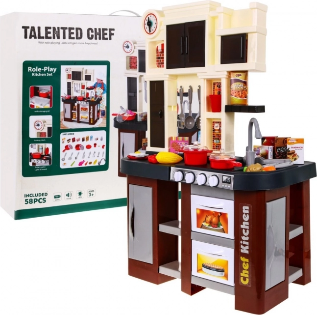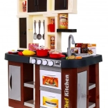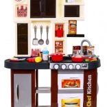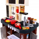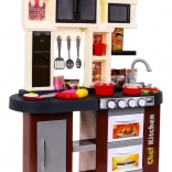 Questa cucina giocattolo di qualità in finitura marrone-nera offre ai bambini un’esperienza di cucina realistica. Ruotando le manopole, i fornelli si illuminano e si sentono suoni autentici di cottura e frittura. Grazie al rubinetto con acqua corrente, i piccoli chef possono provare il vero lavaggio delle stoviglie e la preparazione dei pasti.