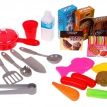 Padelle, pentole con coperchi, piattini, posate, utensili da cucina e verdure, uova e altri “alimenti” per infiniti scenari di gioco.