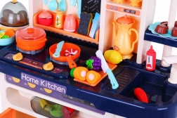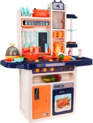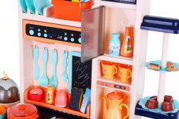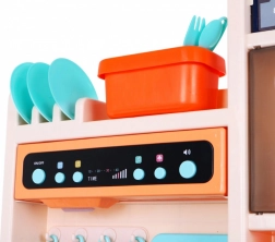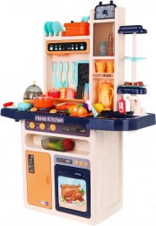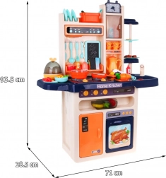 Questa elegante cucina blu trasforma il gioco in un’esperienza realistica. I bambini adoreranno l’acqua corrente dal rubinetto funzionante, i bruciatori retroilluminati con effetti di frittura e bollitura e un fornello che produce delicato vapore. Non mancano forno e frigorifero apribili, cappa con luce e pannello musicale, orologio con lancette mobili e pratiche mensole per le stoviglie.