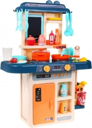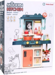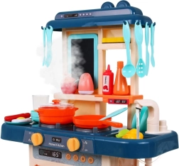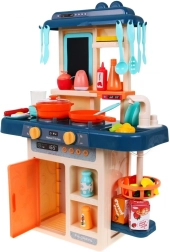 Include un lavello funzionante con rubinetto, nel quale è possibile versare l’acqua, un frigorifero apribile, pratici ripiani e una lavagna per gessetti sopra i fornelli, dove i bambini possono scrivere ricette o liste. Il set comprende in totale 42 elementi tra stoviglie, alimenti e accessori da cucina. Il giocattolo è alimentato da 3× batterie AA (non incluse) e dispone di certificazione CE.