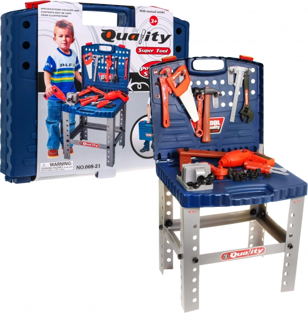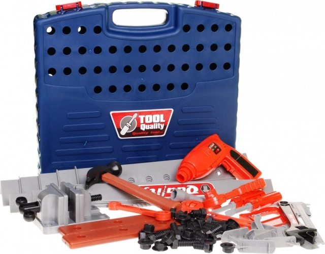 - Totale 45 pezzi: trapano, martello, chiavi, seghetto, cacciaviti, tavole, viti, dadi