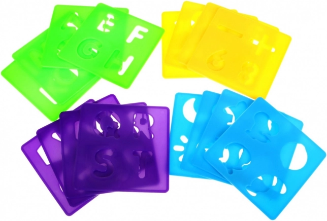 Include 16 stencil con lettere e numeri per lo sviluppo della creatività.