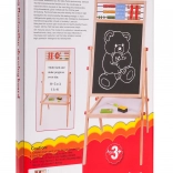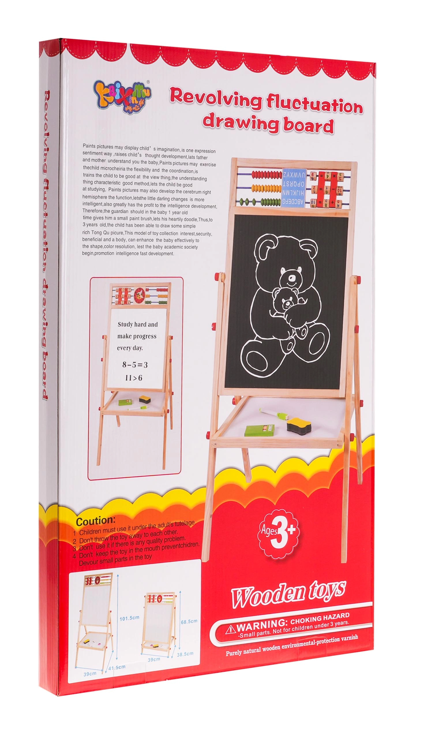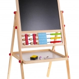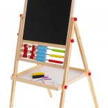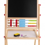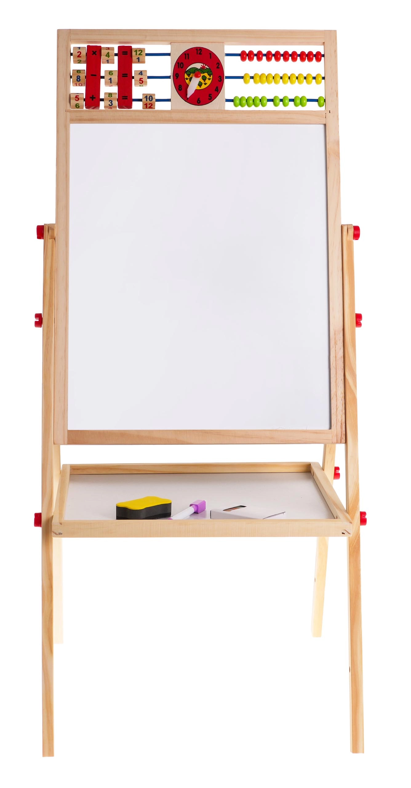 Grande lavagna in legno, doppia faccia per bambini dai 3 anni con lato bianco magnetico tipo whiteboard e lato nero per gesso. Include abaco, orologio didattico e puzzle matematico, mensolina pratica e altezza regolabile. Nella confezione ci sono pennarello con gomma, gessetti colorati e spugnetta – tutto per scrivere, disegnare e imparare giocando.