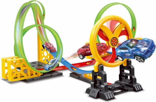 La pista da corsa con due macchinine, loop e cerchio mobile è il giocattolo ideale per bambini dai 3 anni. La pista è facile da montare e garantisce infinite ore di divertimento. Le auto sono dotate di illuminazione LED e sono alimentate da batterie incluse nella confezione.