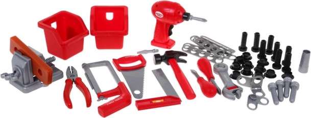 | - officina, - morsa, - cacciavite, - martello, - sega, - seghetto per metallo, - squadra, - pinze, - 2 x cacciavite, - chiave, - punta avvitatrice intercambiabile, - 4 x tassello, - 8 x vite, - 11 x dado, - legno avvitabile, - 8 x elemento rettangolare per avvitare, - 2 x contenitore per attrezzi. | |