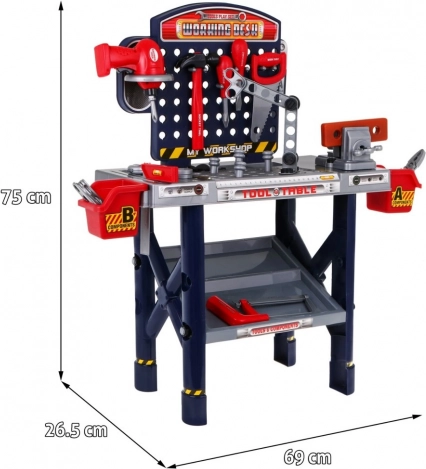 | - officina ca. 69 cm x 26,5 cm x 75 cm, - cacciavite ca. 13 cm x 15,5 cm, - contenitori per attrezzi ca. 9,5 cm x 9,5 cm, - confezione ca. 53 cm x 37 cm x 13 cm. |