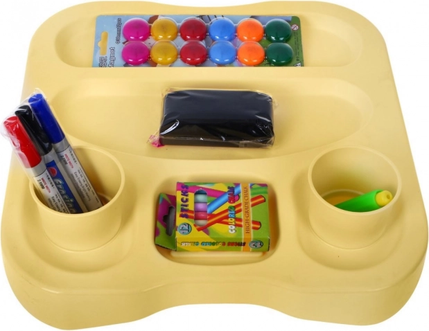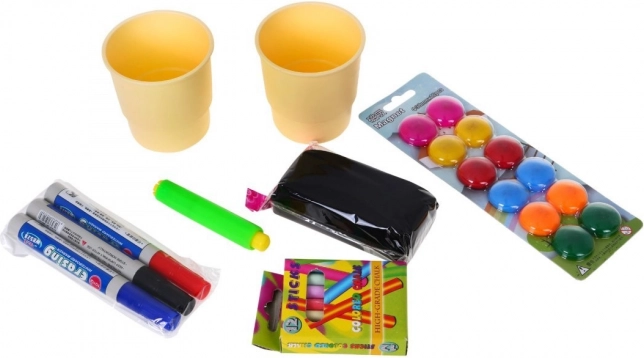 La confezione include bicchierini in plastica, un set di pennarelli, gessetti, magneti e un portagesso, per supportare ogni tipo di attività artistica.