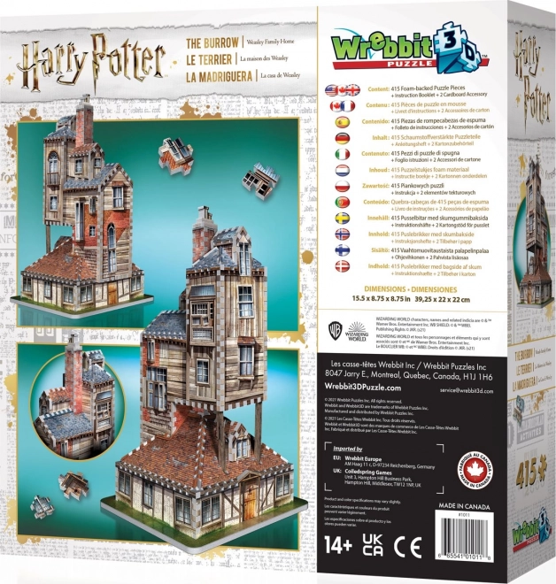 Costruisci la casa iconica della famiglia Weasley – La Tana – come dettagliato puzzle 3D di WREBBIT con 415 pezzi. Grazie al materiale resistente, senza bisogno di colla e a un manuale chiaro, ti godrai una sfida divertente e un modello d’effetto con dimensioni di circa 22 × 22 × 39 cm. Regalo perfetto per i fan di HARRY POTTER e gli amanti dei puzzle creativi.